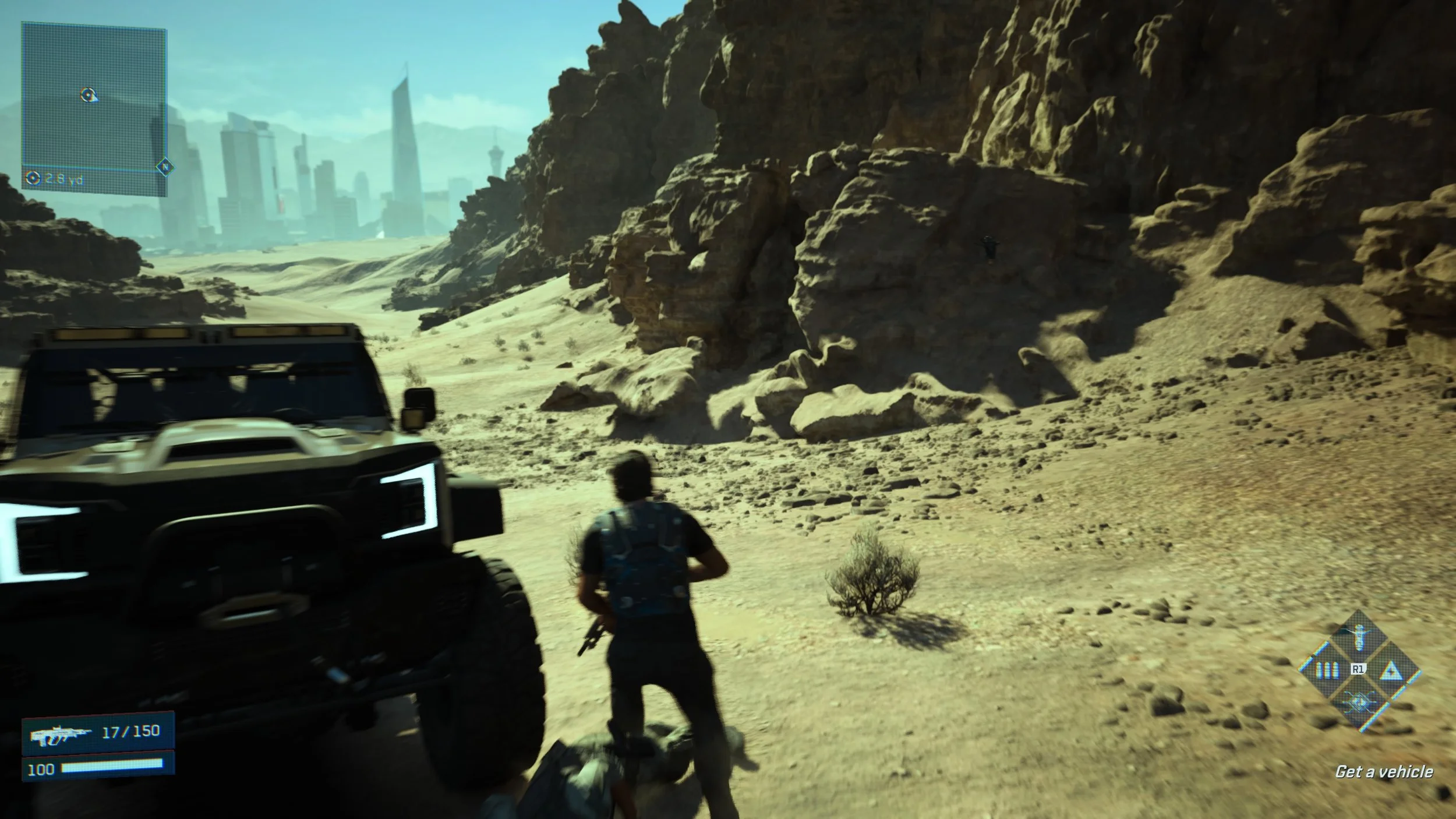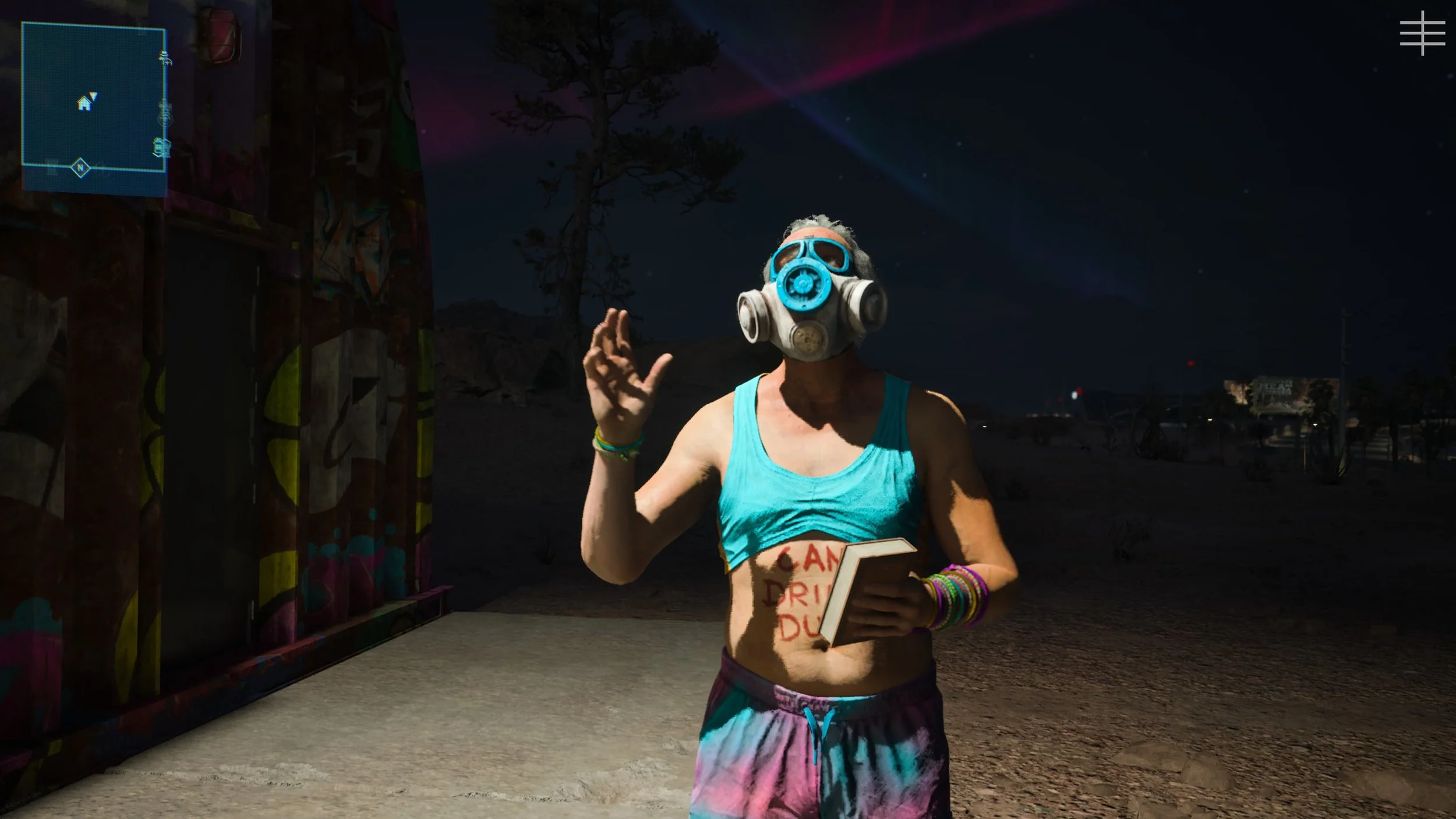 Editor’s Note: When you see credits in MindsEye you load back into the near empty open world (which doesn’t even have a wanted system) get to play as this character… Yes, it says, “Can’t drink dust”, on his belly. No, I do not know why.