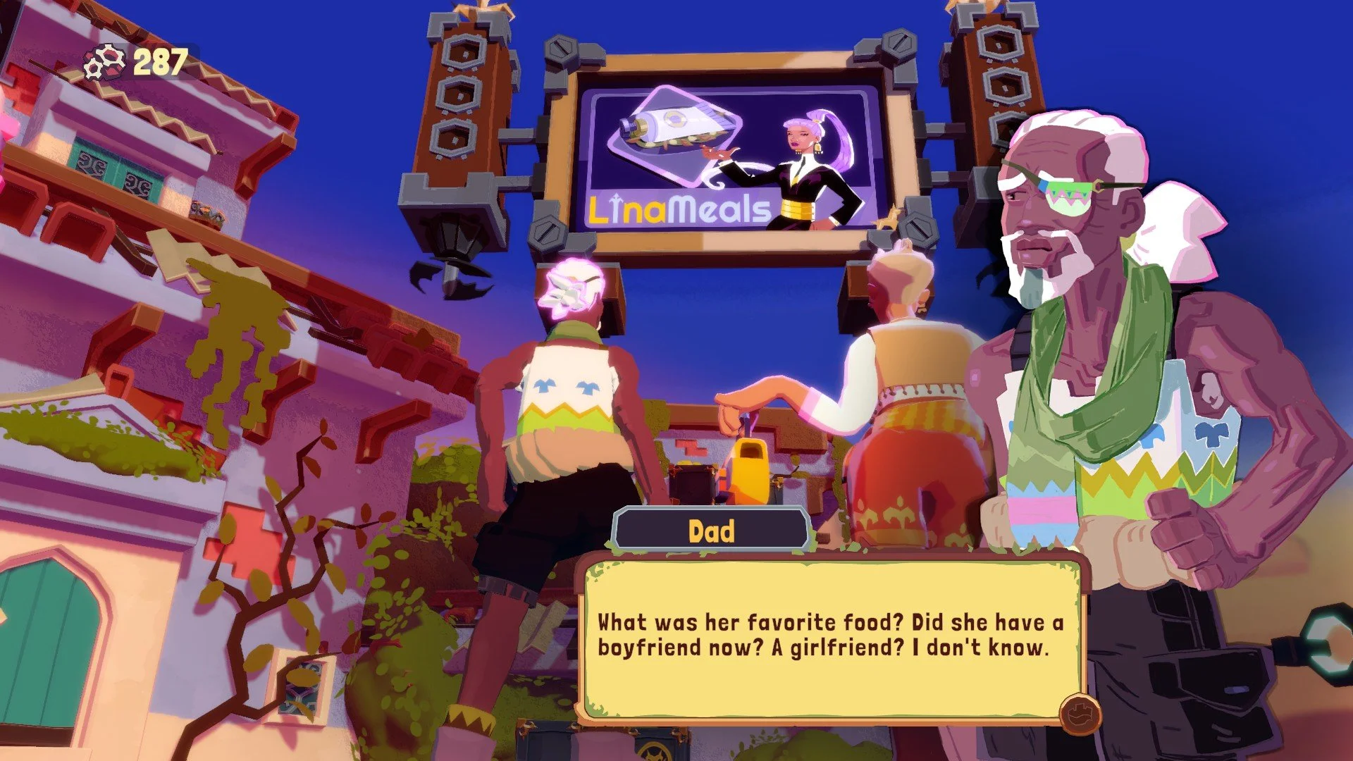It’s not all about the combat, though, as Outerloop Games describes Dosa Divas as a ‘spicy narrative turn-based JRPG’. To this end, I was impressed by the actual gravity given to individual moments in the relatively light overarching plot. Lina might initially seem just a maniacal CEO willing to sacrifice culture and community for profit and, well, she kind of is that, but it comes to light that her outlook might actually have a lot to do with her upbringing alongside her protagonist sisters. Similarly, the tense relationship between Samara and Amani is given space to breathe, with Samara’s fiery nature and brash assumptions actually inflicting genuine pain on Amani at times, who’s carrying considerably more than she lets on. Most affecting is Dosa Divas’ approach to aging and death — the sisters’ parents are entering the elder stages of life in which memory begins to fail, and terrible things can be said by mistake or by choice, and it’s up to their children to figure out which is which. It’s not named explicitly as dementia in the game, but their desperate holding on to their insistence that they just ‘don’t remember’ their children in the same tone as one might forget a chore is recognisable and heartbreaking all the same. Death, too, is something that happens naturally and frequently in this pastel world, and it’s treated with a care, respect, and gentleness I was pleasantly surprised by. There are a multitude of failures, mistakes, and regrets carried by the cast of Dosa Divas, and these heavier concepts are all taken seriously, granted the deserved depth and allowed for amends to be made. This is all supported by an impressive voice cast, granting these scenes an undeniable degree of emotionality that they’d be lacking without it — special mention goes to the voice actors of Amani and her father, who actually placed me on the verge of tears a few times.