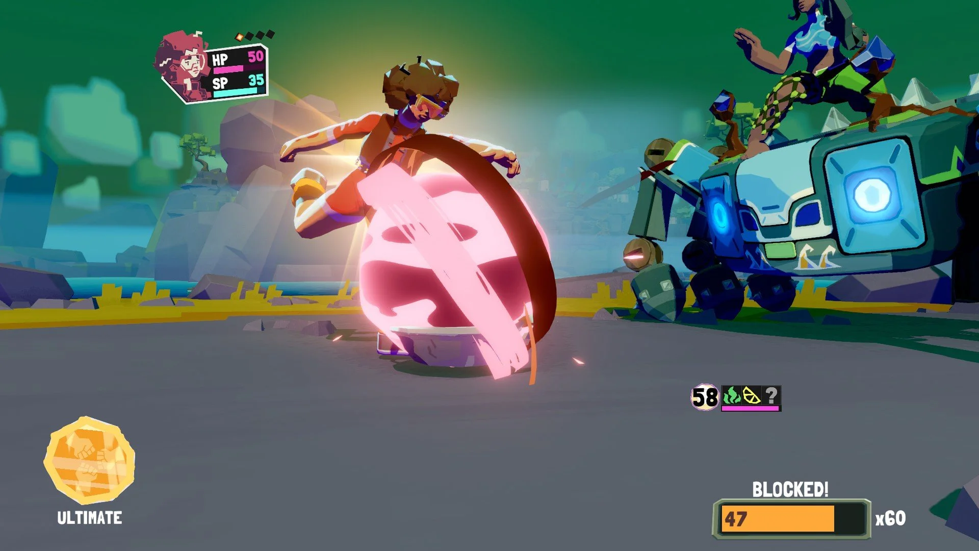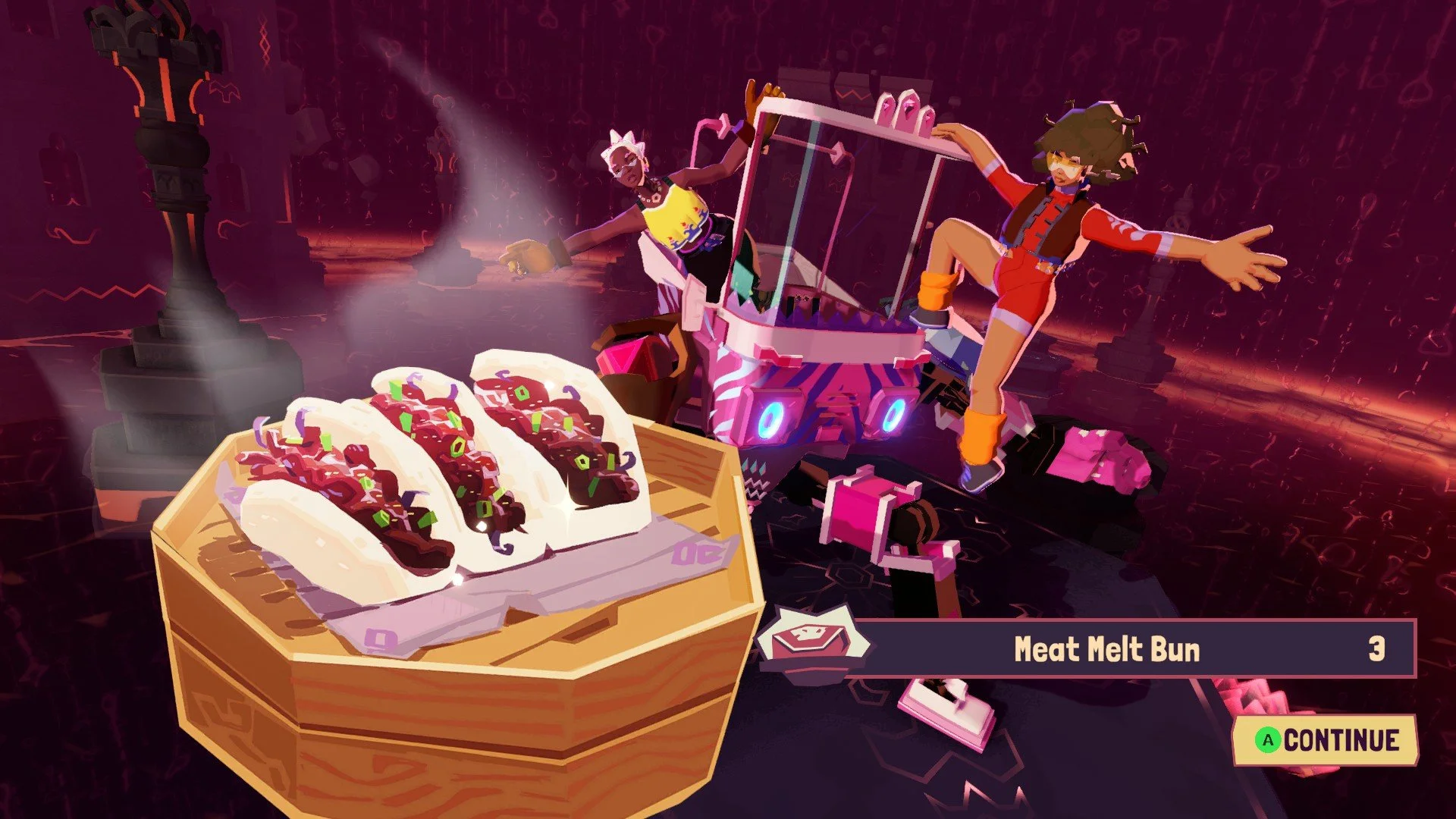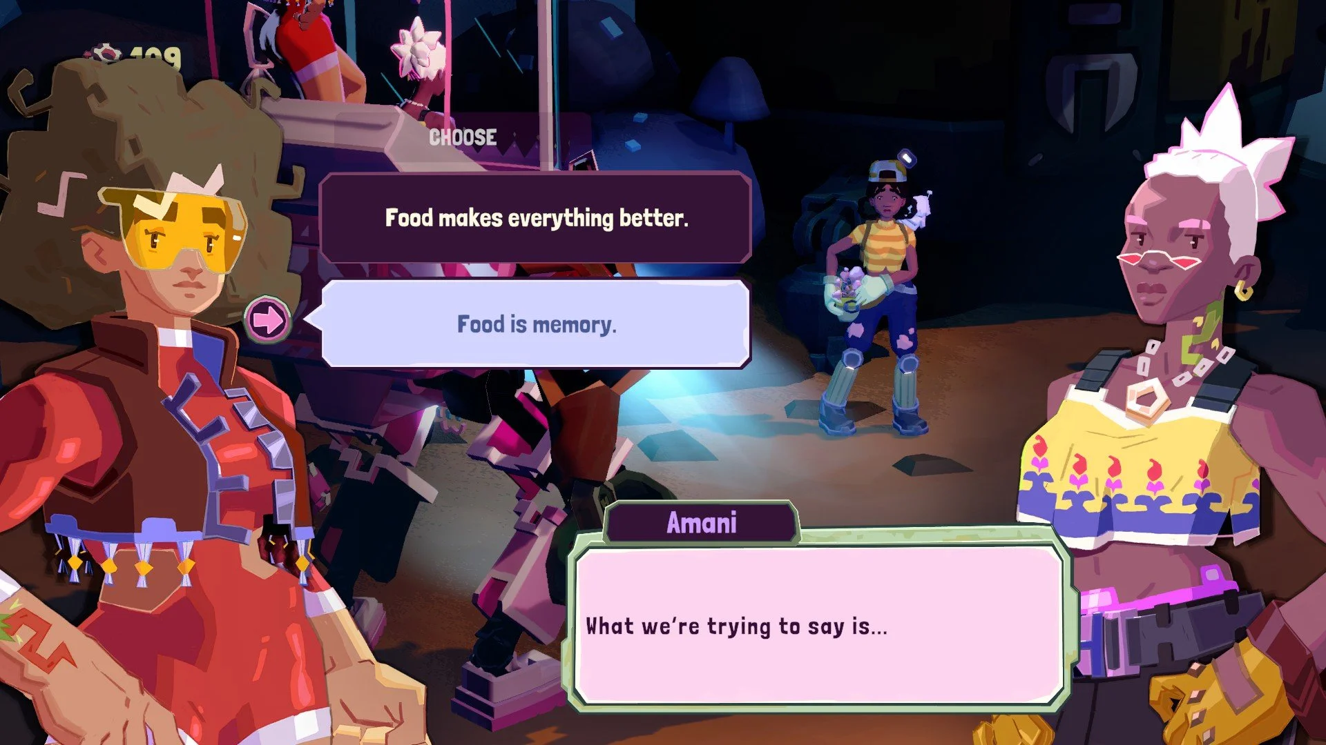 Bearing in mind that you eat with your eyes first (sorry!), Dosa Divas is an incredibly pretty game. The bright and blocky art style, together with the vibrant palette, makes a treat for the eyes (I’m done!) that never turns stale (I promise!) Its eclectic main cast of Samara, Amani, and their adorable war machine Goddess make their way through a land that lost its love for cooking at the hands of HelloFresh — sorry, LinaMeals. Forced into a culinary incompetence by the readily available (see: forced-upon) food tubes sold in terrifying bulk by the company of the leads’ estranged sister, Lina, Samara and Amani are thus responsible for not only taking down this monopolistic megacorporation, but also restoring the art of cooking to these villages still brimming with culture. All of these people and places, from the homely darkness of an underground colony to the artificial perfection of an island resort, bear memories of their historied cuisine; it’s just up to these girls to bring them back.