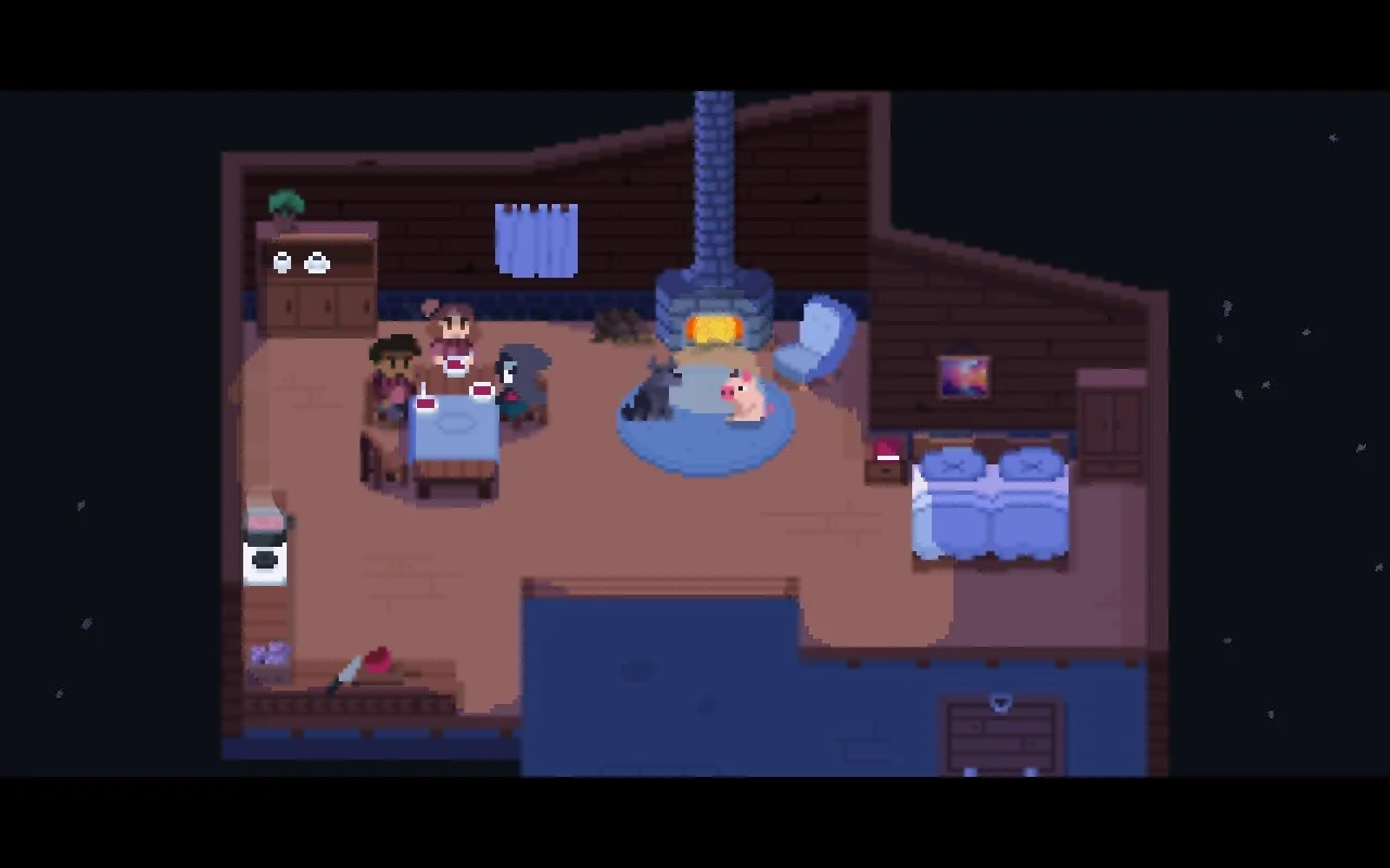 To the townsfolk, Dengel maintains the appearance of the boy they know (knew?). To the player, Dengel appears with all the trappings of the Grim Reaper: scythe, skull, and cloak. However, Reaper-Dengel is anything but grim — his visage is more that of a boy costumed for Halloween. The visual language communicates the other lineage Spindle taps into, the “cozy game”. The cottages of Dengel’s village glow with incandescent interior light against the night. Any of these homes can be entered, their occupants chatted with inconsequentially, their belongings casually inspected. The time that can be spent simply ambling through Dengel’s world far outstrips the story content, which can be completed in about five hours.