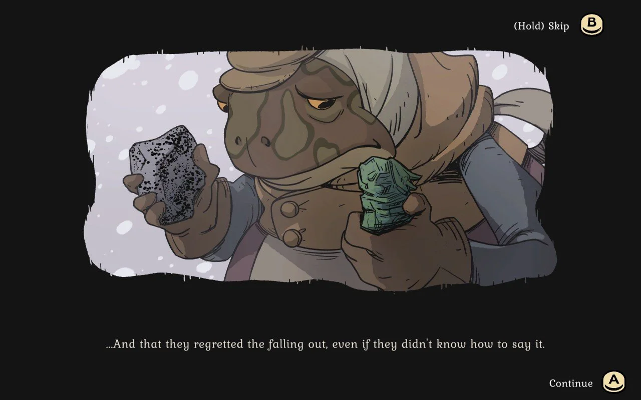 There are also moments of weird narrative pacing. When you rescue your Auntie from an owl’s nest, the rescue occurs in a cutscene, jumping suddenly from a conversation with a different character. Another time, Auntie asked me if I was “still worrying about [my] hedgehog by the lake,” dismissively referring to a character, Moss the Hedgehog, we had not previously discussed. Later in the same conversation, she remembers that she actually knows this person, and even has a meaningful gift from them. Then she starts referring to them as “her” Moss, in a complete reversal of her previous aloofness. This is not the only time the game’s writing revealed that I had done something, or even just spoken to certain characters, out of its expected order.